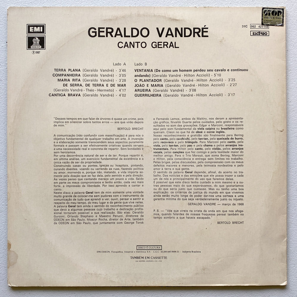 Discover the essence of Brazilian music with the LP "Canto Geral" by Geraldo Vandré. Released under the renowned EMI label, this vinyl is a masterpiece that captures the depth and emotion of one of Brazil's most influential artists. "Canto Geral" offers an immersion into poetic lyrics and captivating melodies, reflecting the country's rich cultural tradition. Ideal for collectors and music lovers, this vinyl record is an essential piece for those who wish to explore the nuances of Vandré's repertoire. Enjoy the unique sound quality that only an LP can provide and add this classic to your collection.