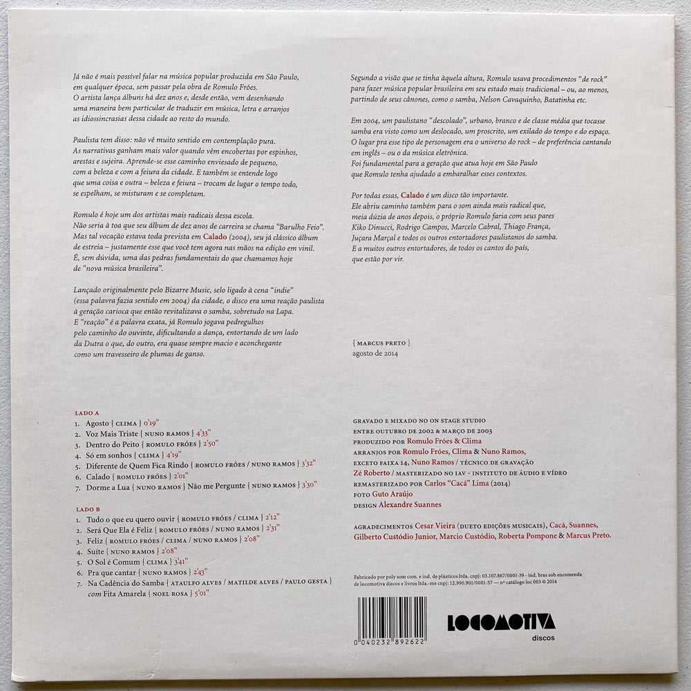Discover the musical essence of Romulo Fróes with the LP "Calado," a masterpiece that reflects the depth and sophistication of contemporary Brazilian music. Released by the Locomotiva Discos label, this vinyl record offers a collection of tracks that capture Fróes' unique ability to blend poetry and melody in an engaging way. Perfect for vinyl enthusiasts and those who appreciate Brazil's rich musical culture, "Calado" is an indispensable addition to your collection. Get it now and immerse yourself in the introspective and captivating atmosphere of this exceptional album.