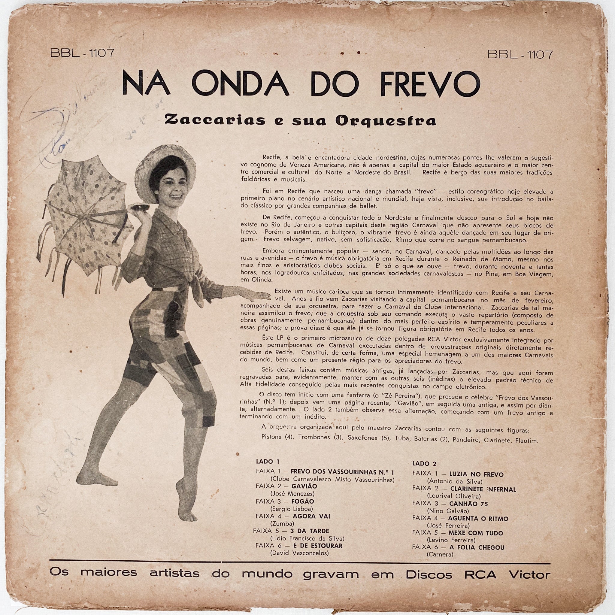 Discover the vibrant energy of Pernambuco's carnival with the album 'Na Onda Do Frevo' by Zaccarias And His Orchestra. This LP, released under the renowned RCA Victor label, captures the essence of frevo, one of the most infectious musical genres in Brazil. Zaccarias' orchestra delivers exuberant arrangements that make this record an irresistible sonic celebration. Ideal for collectors and lovers of Brazilian music, 'Na Onda Do Frevo' is an authentic journey to the festivities of northeastern Brazil, right on your turntable. Don't miss the opportunity to add this frevo gem to your vinyl collection.