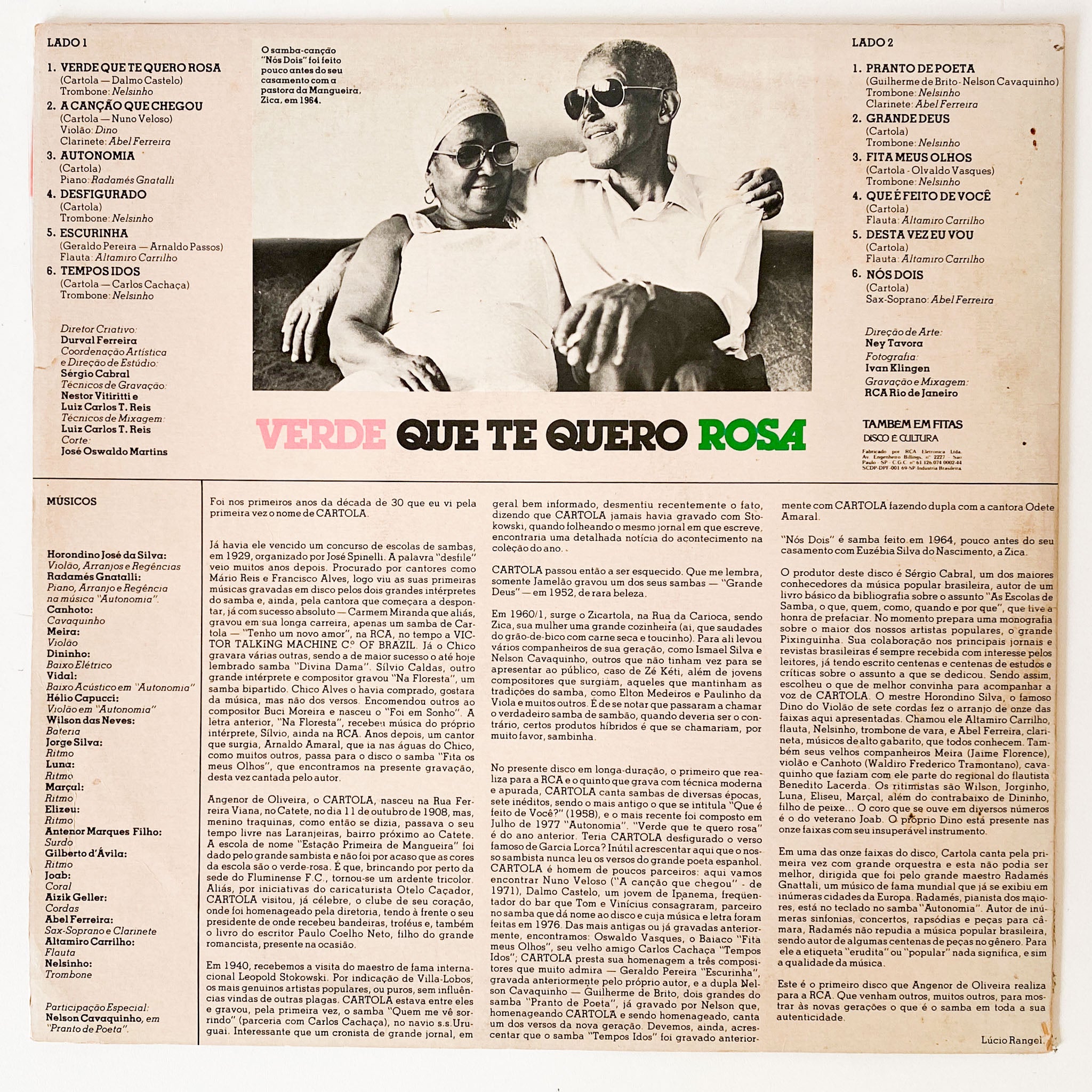 Translate into English: The LP "Verde Que Te Quero Rosa" by the iconic Brazilian artist Cartola is a true masterpiece of Brazilian popular music. Released under the renowned RCA Victor label, this album is a rare gem for lovers of samba and MPB. Recorded in Brazil, the record captures the essence of Cartola's poetic and musical talent, featuring a collection of tracks that are both moving and timeless. With captivating melodies and profound lyrics, "Verde Que Te Quero Rosa" is an essential item for any vinyl collection. Acquire this classic and immerse yourself in the rich musical tradition of Brazil through the voice and guitar of one of its most revered composers.
